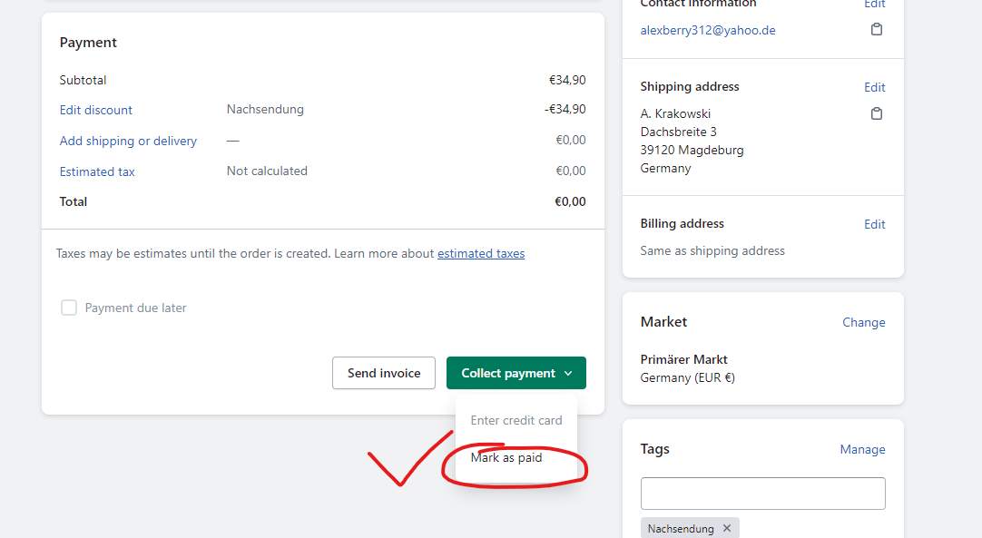 Mark as Paid: erst dann wird als Bestellung beim Logistiker angezeigt